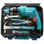 Ensemble d’outils 115 pièces avec perceuse, marteau, pinces, forets, embouts et accessoires essentiels pour bricolage et professionnels.