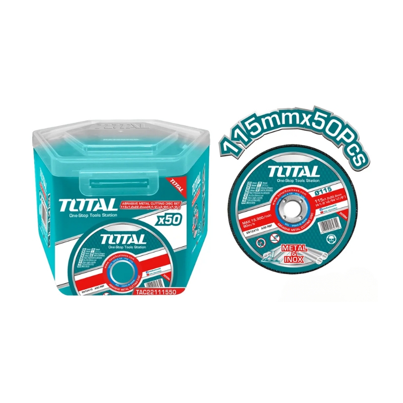Ce jeu de 50 disques à tronçonner métal TOTAL est idéal pour les travaux intensifs en atelier ou sur chantier. De plus, son diamètre de 115 mm et son alésage de 22,2 mm assurent une compatibilité parfaite avec la majorité des meuleuses d’angle.