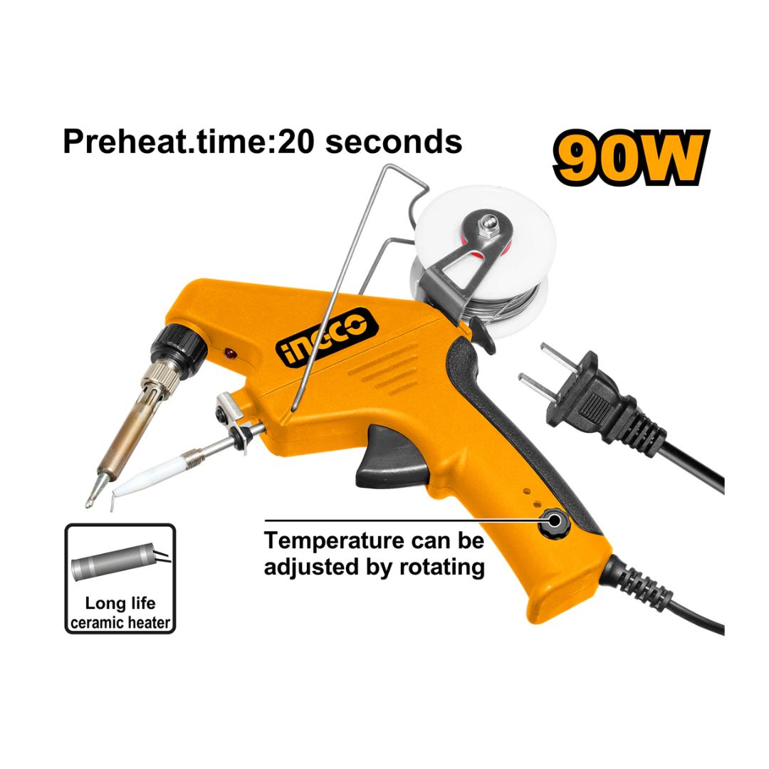Le pistolet dispose d’une tête droite avec dévidoir intégré, facilitant l’alimentation du fil de soudure directement pendant l’utilisation. De plus, le thermostat et la molette de réglage vous permettent de contrôler précisément la température selon le matériau et la taille de vos composants. Cela rend le pistolet à souder 90W INGCO particulièrement adapté aux travaux délicats sur circuits imprimés, câbles fins et autres projets électroniques.