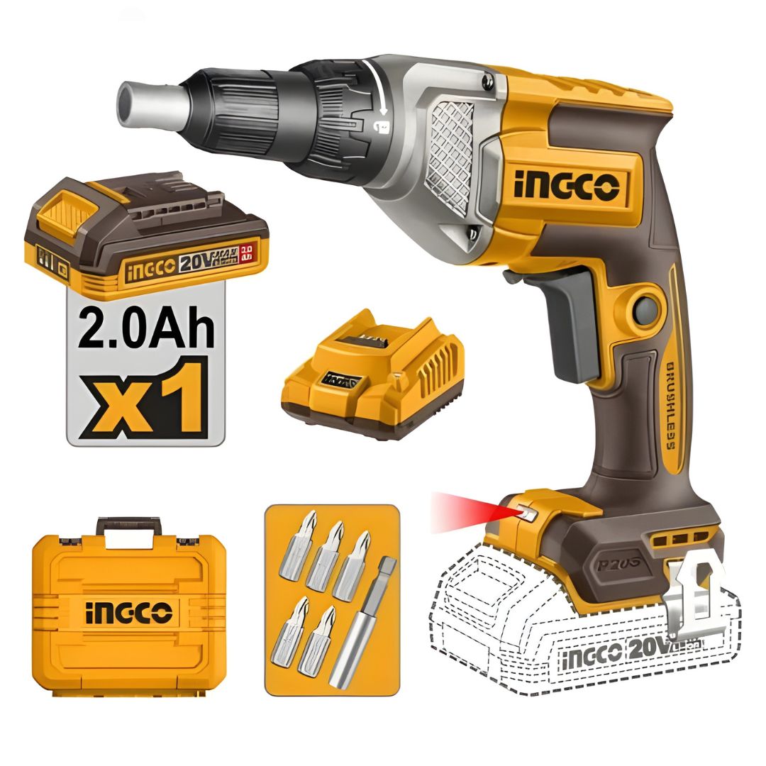 La visseuse à cloison sèche INGCO est livrée avec une batterie lithium-ion de 2,0 Ah et un chargeur. Le kit inclut aussi cinq embouts de vissage et un porte-embout pratique. Vous pouvez commencer à travailler immédiatement sans achat supplémentaire.